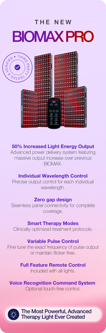 Der BIOMAX PRO bietet fünf wesentliche Verbesserungen: 50 % mehr Lichtenergie (kürzere Behandlungszeiten/höhere Leistung), eine lückenlose Konstruktion, die den Spalt zwischen den einzelnen Paneelen eliminiert, individuelle Wellenlängensteuerung, einstellbare Impulsleistung und intelligente Smart-Modus-Voreinstellungen. Dieselbe branchenführende Qualität in medizinischer Qualität – nur deutlich leistungsstärker und präziser. Der BIOMAX PRO ist die leistungsstärkste und fortschrittlichste Lichttherapielampe für den Menschen, die je entwickelt wurde – mit einem einzigartigen, revolutionären Design.